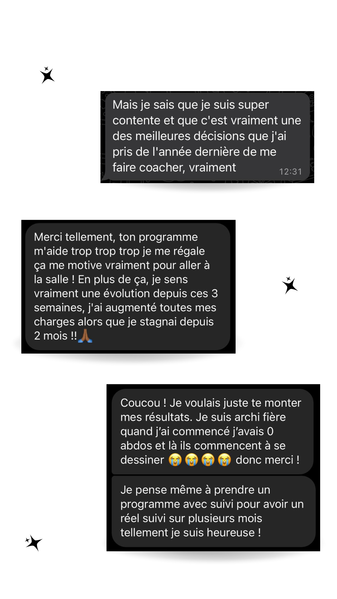 ÉTAPE 6️⃣ : À la fin de ton premier programme, au bout de 4 à 5 semaines, on se prévoit un call pour faire le point, voir ton évolution, points forts/faiblesses, comment tu te sens etc pour que je puisse créer ta 2nd programmation ! Le but en renouvelant ton programme va être d'éviter les périodes de stagnation, découvrir de nouveaux exercices pour te challenger toujours plus 🔥 On répètera ça encore une fois pour atteindre les 3 cycles complets !