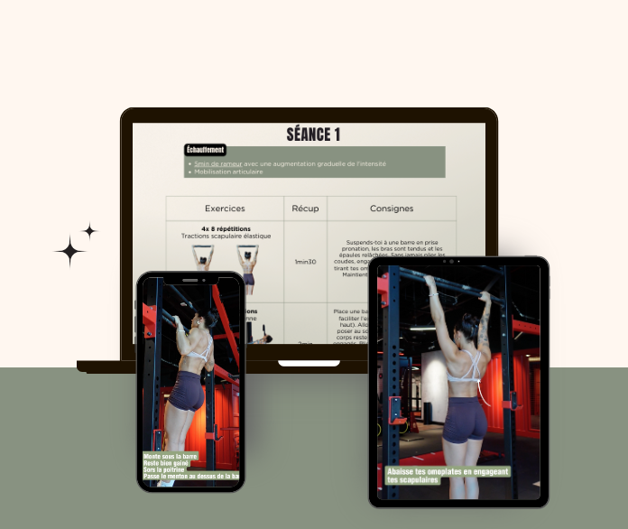 Tu trouveras ton programme sous format PDF avec une photo pour chaque exercice et une consigne écrite ainsi que des vidéos pour chaque exercices avec les explications et choses à ne pas faire 🎦